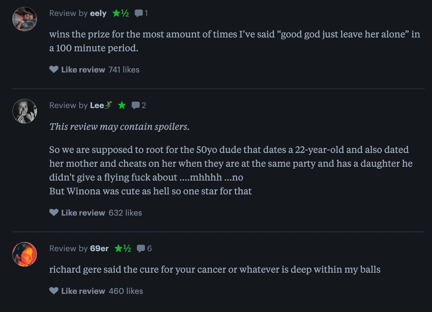 Attempting to be a weepy melodrama and a quirky romance and a portrait of a bastard man and a beautiful decaying soul all at once, Chen’s movie is a bathetic soup of misguided emotions, lathered in endlessly baffling directorial choices (slo-mo sex scenes, repeated reaction shots, raw, unsubtle, frankly needy acting). It’s also extremely odd the way that they keep referencing the age gap and the fact that Keene was in a relationship with her mother (and possibly her grandmother). It made me constantly believe, given that anything is possible in the movies, that the movie would end with the sick revelation that he is actually her father. The mere possibility made this a deeply sick horror movie.